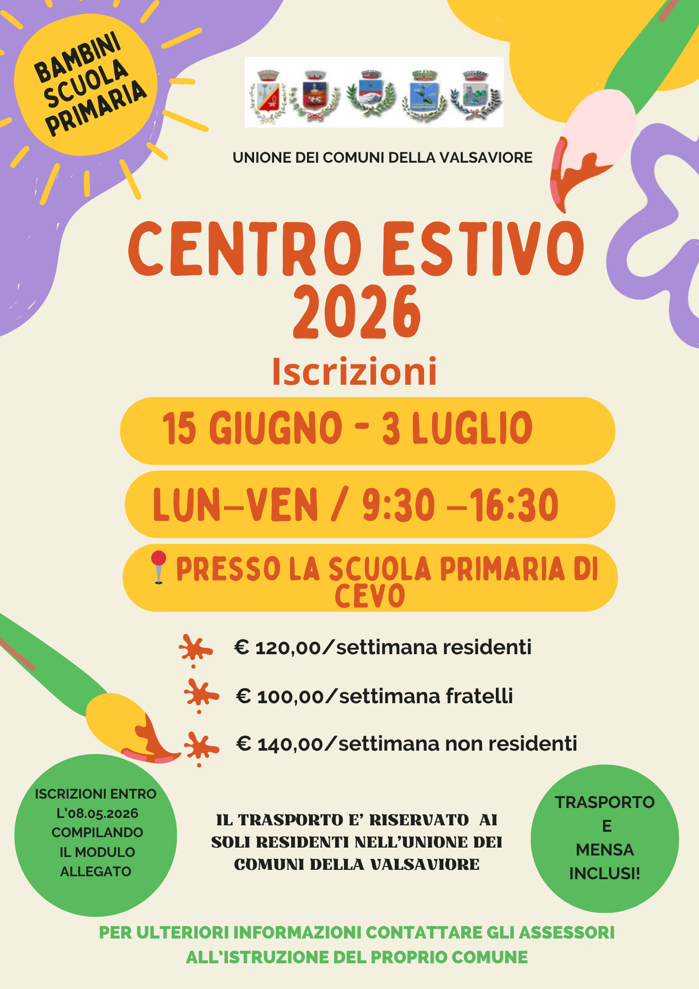 Qualora fossi interessato/a all'iscrizione ti invitiamo a compilare il modulo allegato e a consegnarlo al tuo comune di residenza entro e non oltre venerdì 8 maggio 2026, oppure trasmetterlo all'indirizzo e-mail istituzionale del tuo comune.
